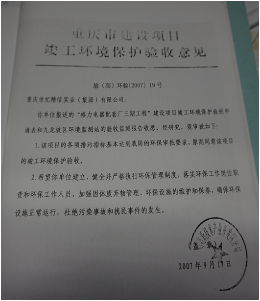 格力電器配套廠三期工程環(huán)境保護(hù)驗(yàn)收意見