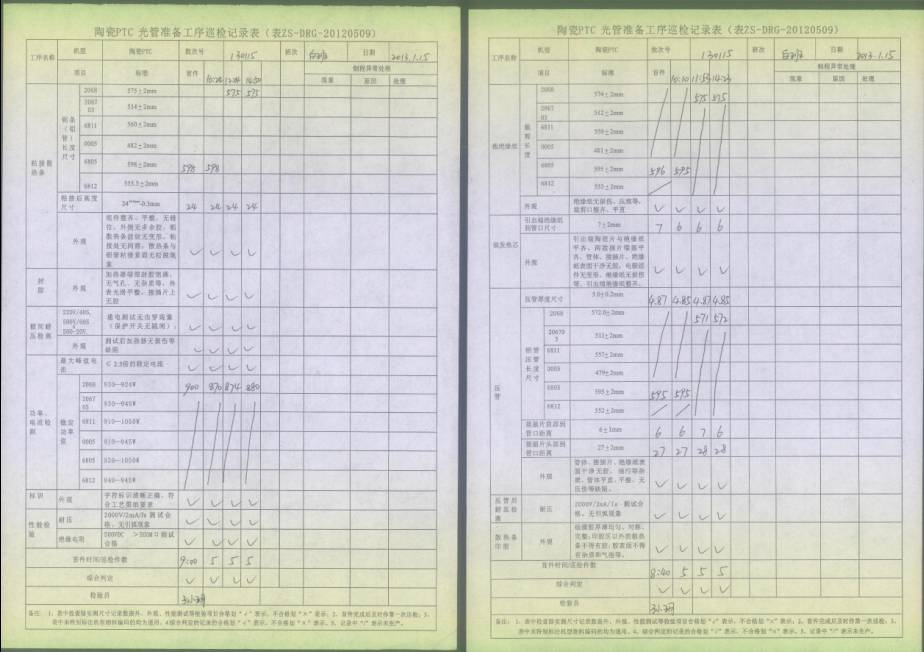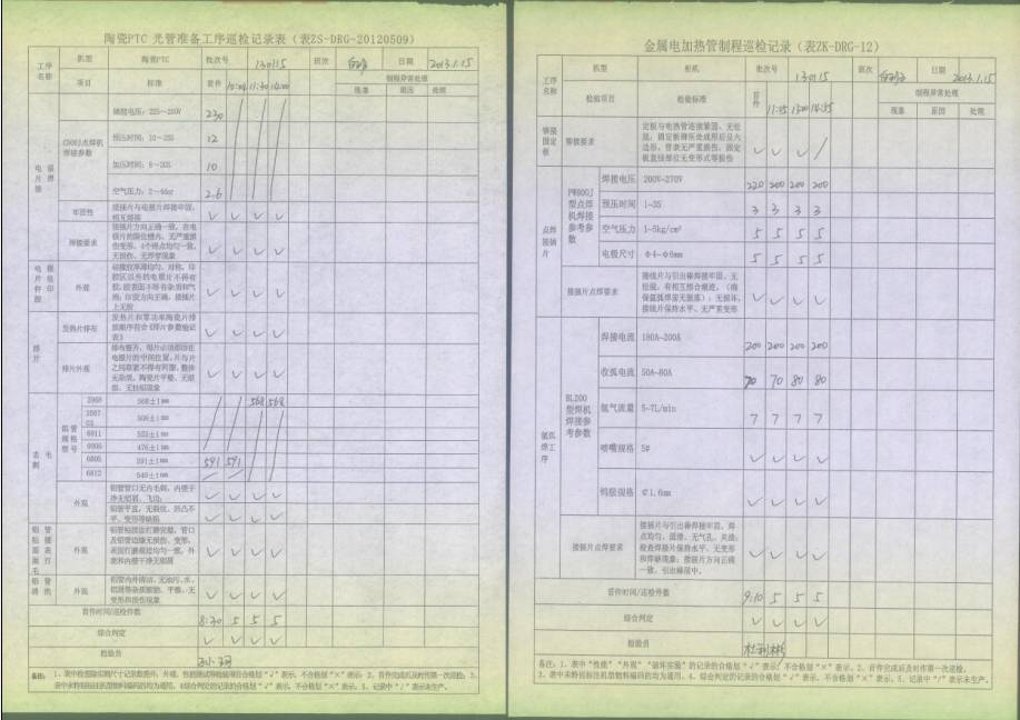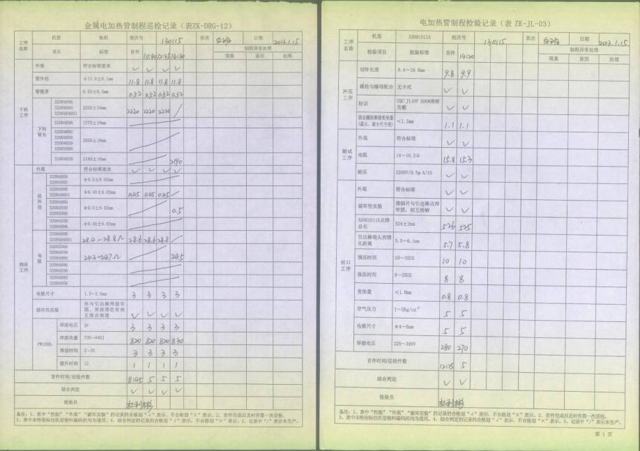 電熱管車(chē)間首件、制程巡檢、末件表